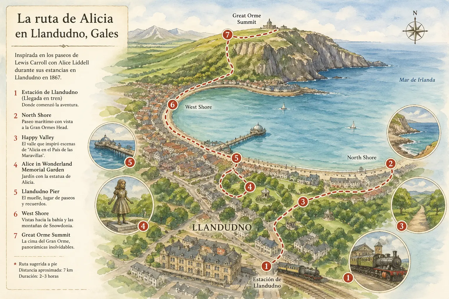 Ubicada en la costa norte de Gales, en el Reino Unido, Llandudno no es solo conocida por sus playas victorianas y su impresionante Great Orme, sino también por su conexión con uno de los cuentos más célebres de la literatura inglesa: “Alicia en el País de las Maravillas”, uno de mis libros favoritos de todos los tiempos. Esta relación única se celebra mediante la “Ruta de Alicia” (Alice Trail), una ruta temática que transforma un paseo por el pueblo, en una aventura mágica a través del mundo creado por Lewis Carroll y sus personajes, que como sabemos es el seudónimo de Charles Lutwidge Dodgson.